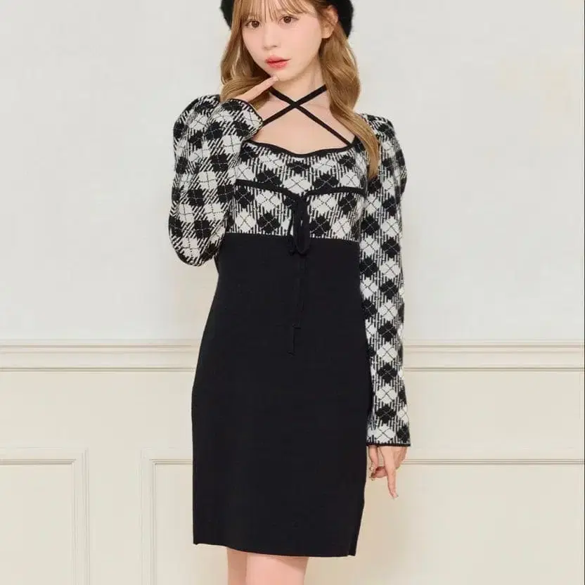 크로스 리본 니트 미니 원피스