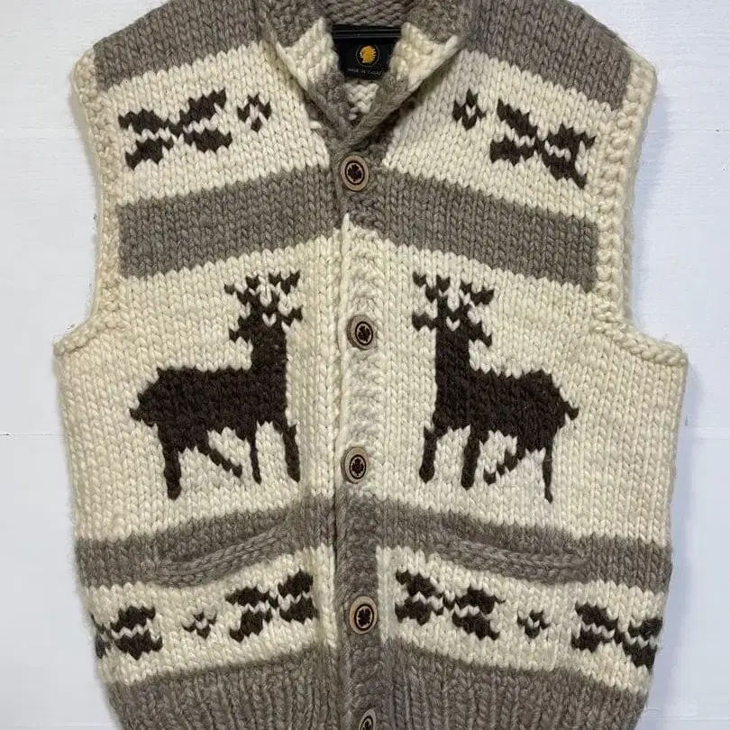 ☆ 브랜드 [ KISITAU ]의, 사슴 모티브가 장식된 울 소재 코위찬 니트 베스트입니다. 코위찬 니트는 캐나다 밴쿠버 섬에 사는 코위찬족이 사냥 시 착용하던 전통적인 스웨터에서 유래되었습니다. 탈색, 염색되지 않은 양모 자체의 색감 (그레이, 브라운, 아이보리 등)과 동물, 기하학적인 전통 모티브가 특징입니다. 초와이드 실로 손뜨개질되었습니다. 내구성이 높고 보온성이 뛰어납니다. 착용할수록 털실이 펠트처럼 되어 보온성이 더욱 증가하기 때문에, [50년은 입을 수 있다]고 불릴 정도로 오래 애용할 수 있는 아이템입니다. • 사이즈 표기 없음 (불명) 기장 약 70cm 어깨 너비 약 55cm 가슴 너비 약 64cm ※ XL 상당 ※ 평평하게 놓은 상태에서의 개인 측정입니다. 약간의 오차는 양해 부탁드립니다. ※ 눈에 띄는 상처나 얼룩 없음으로 되어 있지만, 보풀은 약간 있습니다. 카라 네임의 고정 실이 2개 끊어져 있습니다. (손바느질로 수선 가능할 것으로 생각됩니다) 사진 6, 7번째 ※ 구제 의류에 이해가 있는 분들의 구매를 기다립니다.