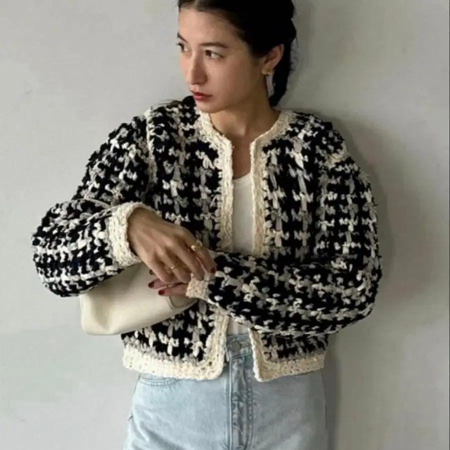 리본을 손으로 뜨개질한 정성스러운 니트 가디건.