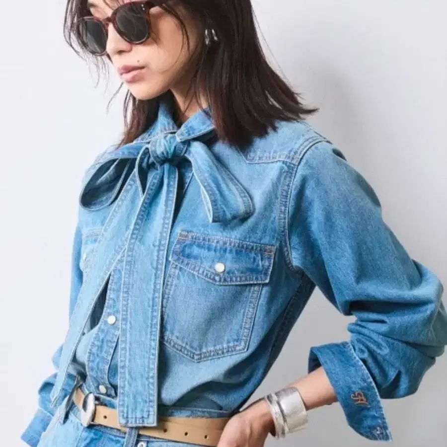 면 100% 라이트 온스 데님 리본 타이 부착 셔츠