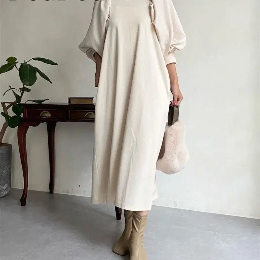 DouDou 볼륨 소매 이소재 절개 원피스 베이지