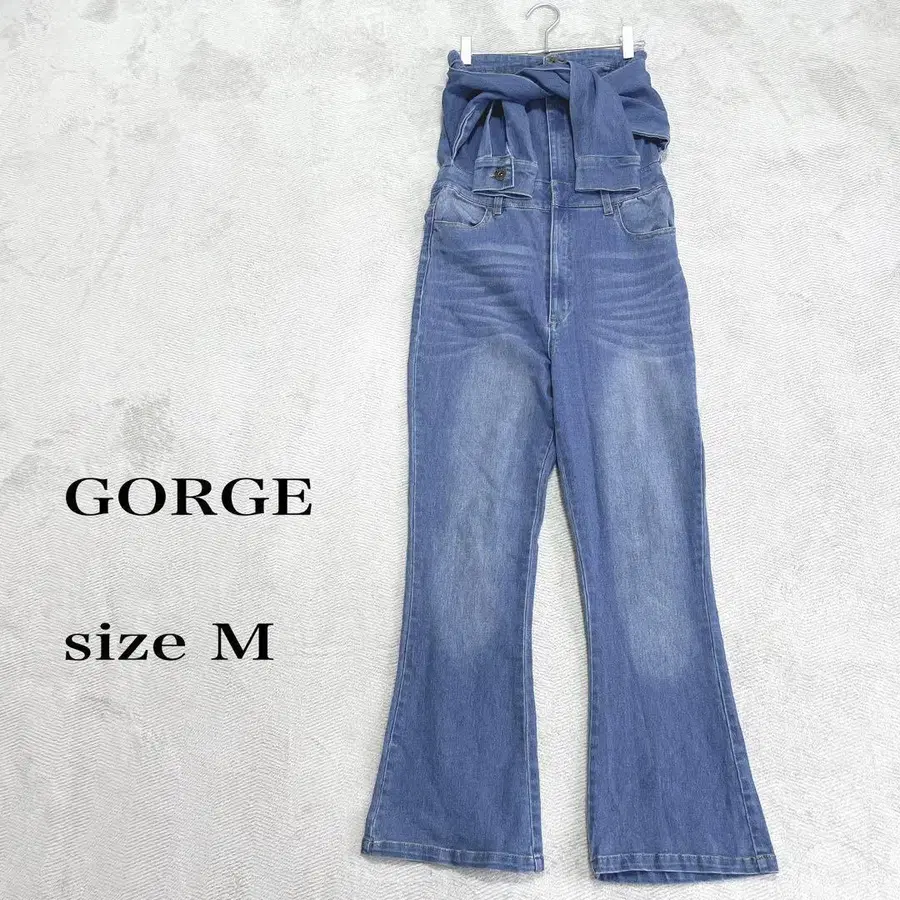 하이웨스트 디자인의 플레어 데님 팬츠, 허리 리본 포함으로 스타일리시합니다.