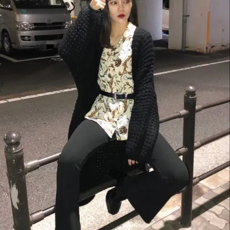 HARE 3게이지 BIG 와플 롱 가디건 블랙