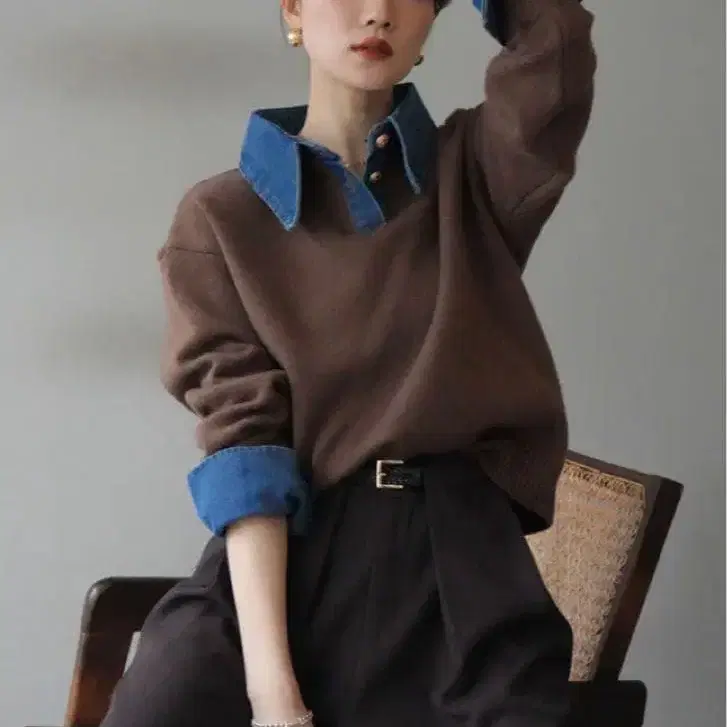 데님 옷깃 폴로 니트 풀오버 브라운/lumier 뤼미에 같은 형태