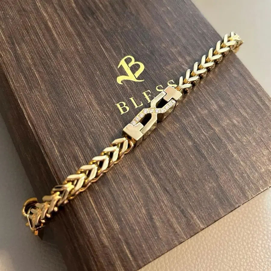 크로스 디자인에 큐빅 지르코니아가 장식된 럭셔리한 골드 체인 팔찌.
