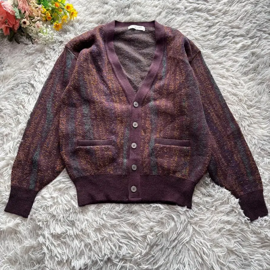 울 니트 가디건 남성용 [ F ] 보라색 멀티 스트라이프 V넥 일본제