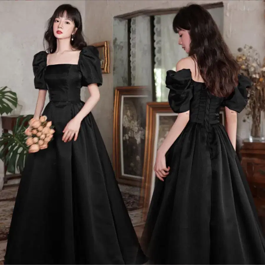 블랙 롱 드레스 퍼프 슬리브 스퀘어넥 연주회 사전 촬영 파티