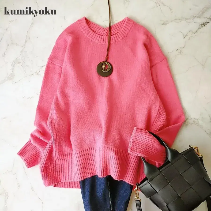 쿠미쿄쿠의 편안한 실루엣으로, 가을/겨울 코디네이트를 화려하게 만들어 줄! 핑크색 풀오버 니트를 판매합니다.