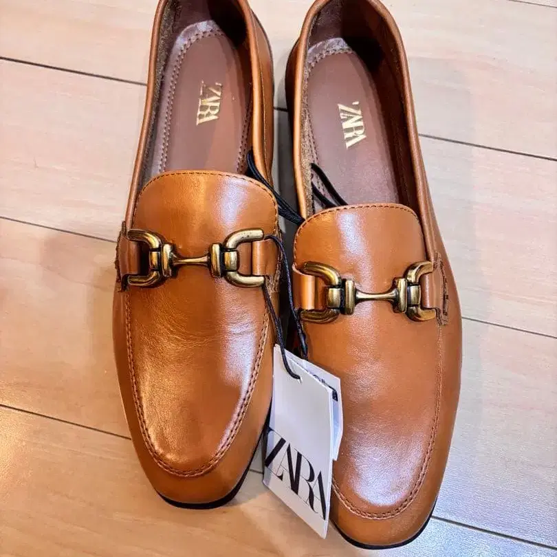 [ 미사용 새상품 ] ZARA 체인 디테일 스플릿 레더 로퍼 브라운