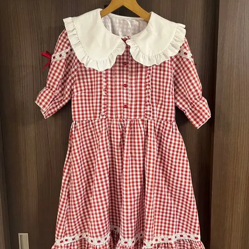 빨간색과 화이트 체크 무늬 반팔 원피스 M
