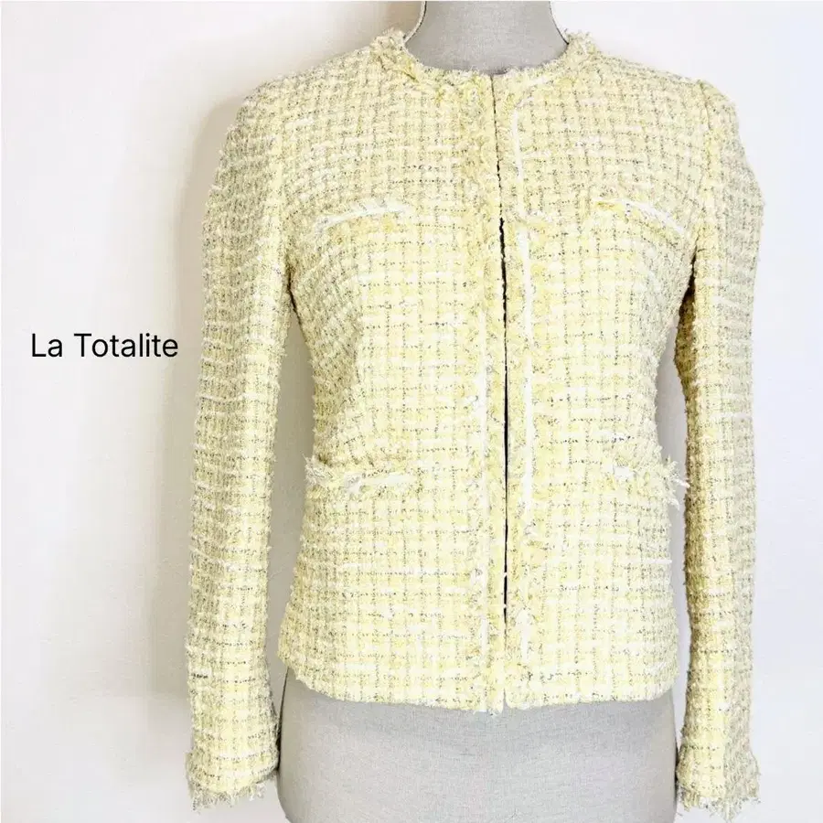 [ 상세 ] 옐로우 컬러, 화이트, 블랙, 실버 라메 실이 짜인 팬시 트위드 원단으로 제작된 노카라 자켓입니다.