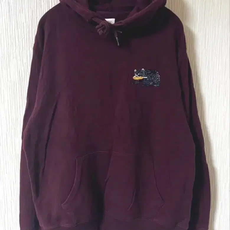 와인 레드 색상의 후드 부착 맨투맨, 프론트에 곰 자수가 있어 귀여운 디자인입니다.