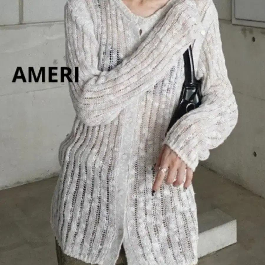 멜란지 실을 로우 게이지로 편직하여 적당한 시어한 느낌을 주는 니트탑.