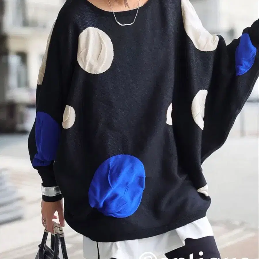 antiqua 도트 무늬 돌먼 니트/블랙 x 블루