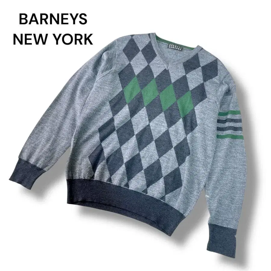 BARNEYS NEW YORK의 이탈리아제 V넥 니트입니다. 그레이를 베이스로, 차분한 톤의 그린을 배색한 아가일 체크가 고급스러운 인상을 줍니다. 왼쪽 소매에만 적용된 보더 라인의 비대칭 디자인이 악센트가 되어 위트 있는 아이템입니다. 고급 메리노울 혼방 소재를 사용하여 얇으면서도 따뜻하며, 부드러운 촉감과 신축성을 겸비하고 있습니다. V넥 라인의 안감에도 그린이 사용되어 세부까지 코다와리가 느껴지는 마무리입니다. 눈에 띄는 흠집이나 얼룩이 없는 새상품급으로, 비즈니스 이너부터 휴일 스타일까지 폭넓게 활약합니다.