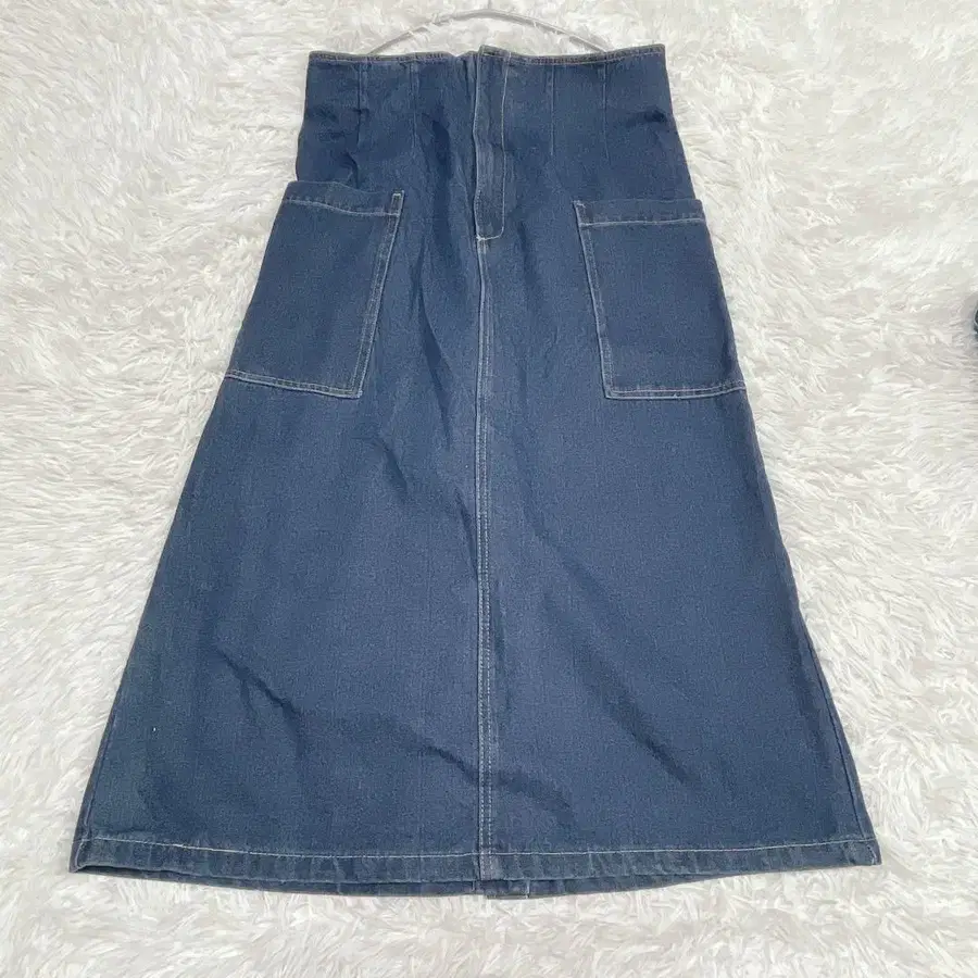 다크 블루 색상의 데님 롱 스커트이며, 포켓이 있어 실용적입니다.