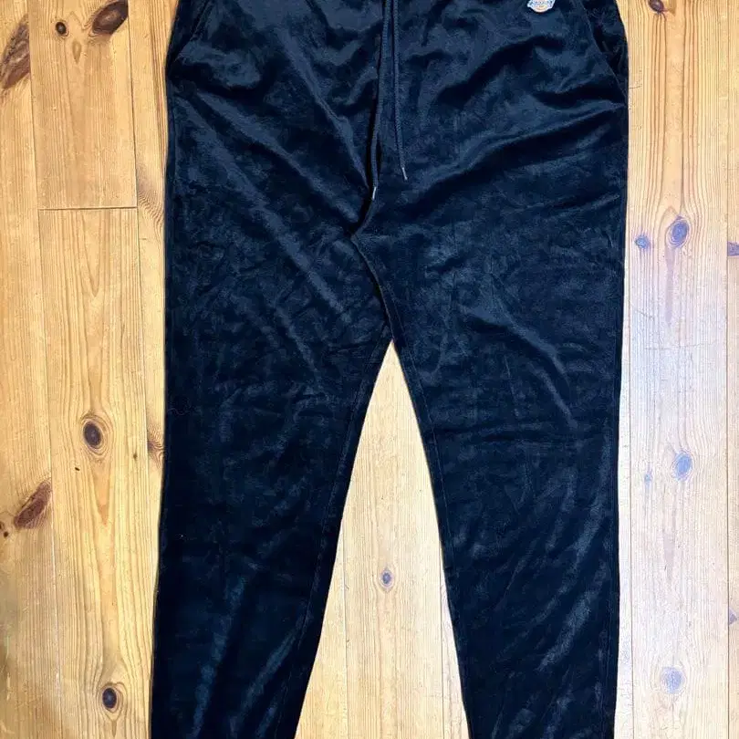 레이온 혼방 벨로아 소재의 블랙 조거 팬츠, 리브 니트 밑단, 로고 포함.
