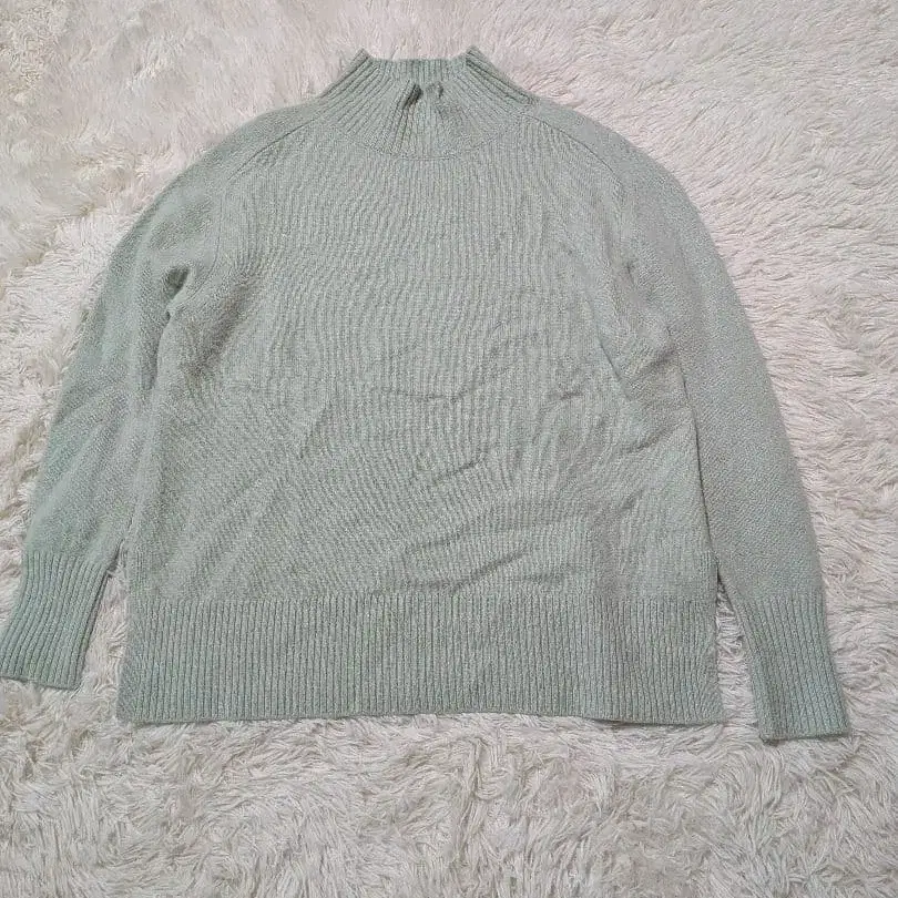 민트 그린 하이넥 니트, 리브 디자인으로 보온성과 스타일을 동시에 잡았습니다.