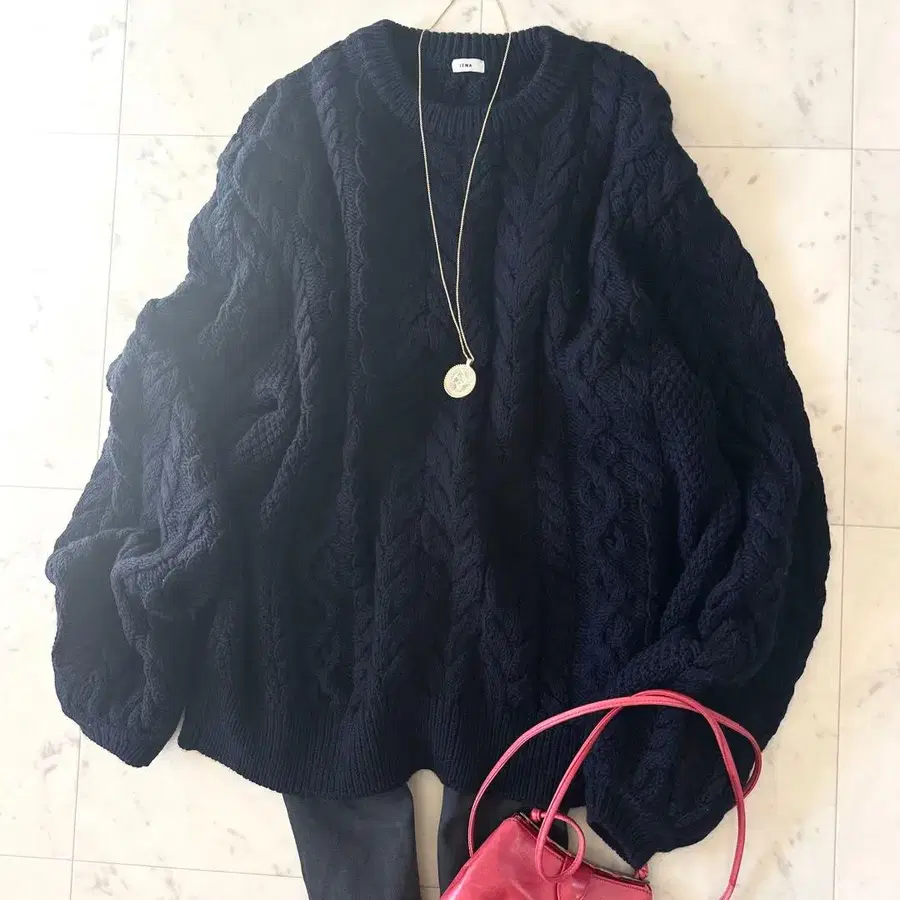 새상품급 이에나 케이블 볼륨 슬리브 풀오버 크루넥 니트 네이비 컬러