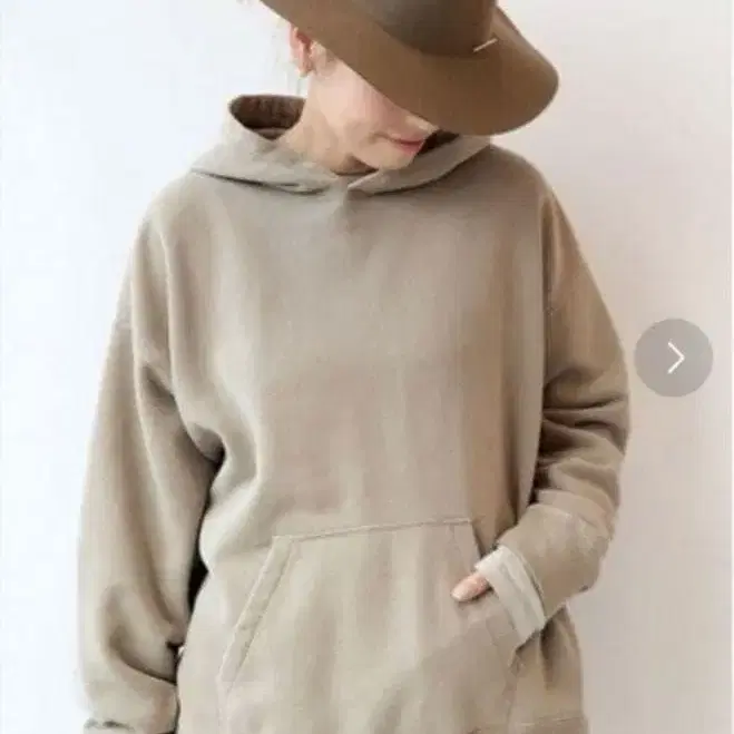 베이지 색상의 후드 부착 후드티, 루즈핏 디자인으로 쾌적함을 추구.