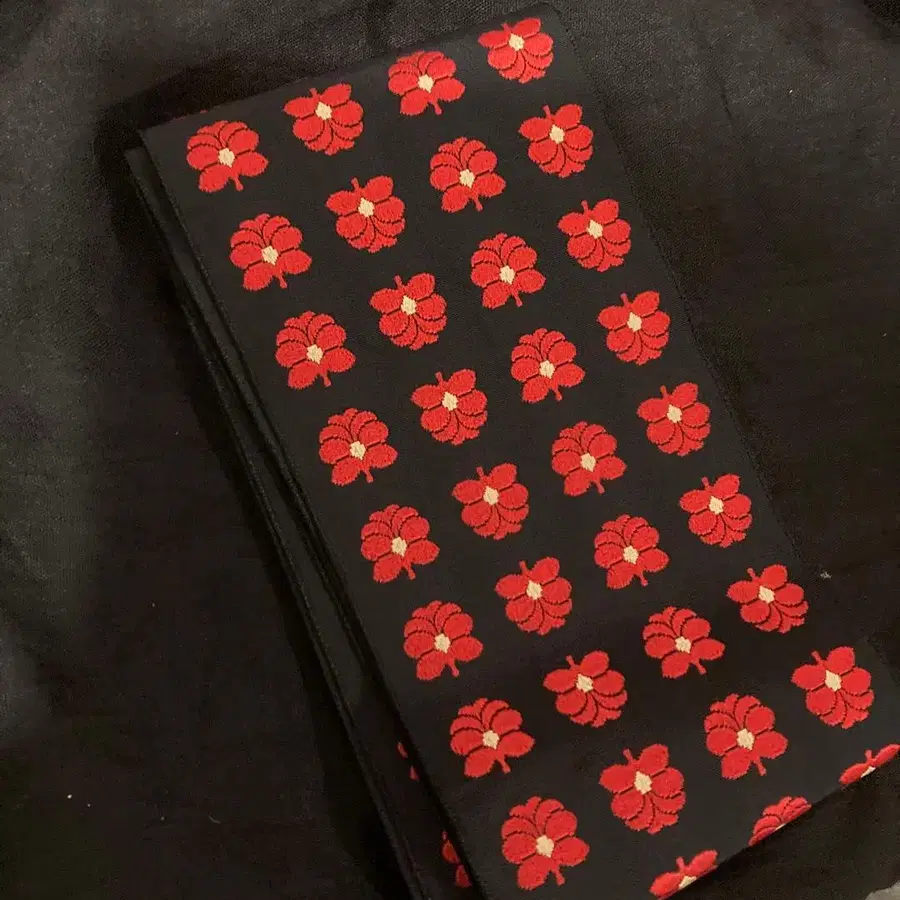 하카타 오리 순수 실크 블랙 베이스 빨간색 꽃 자수 반폭 오비