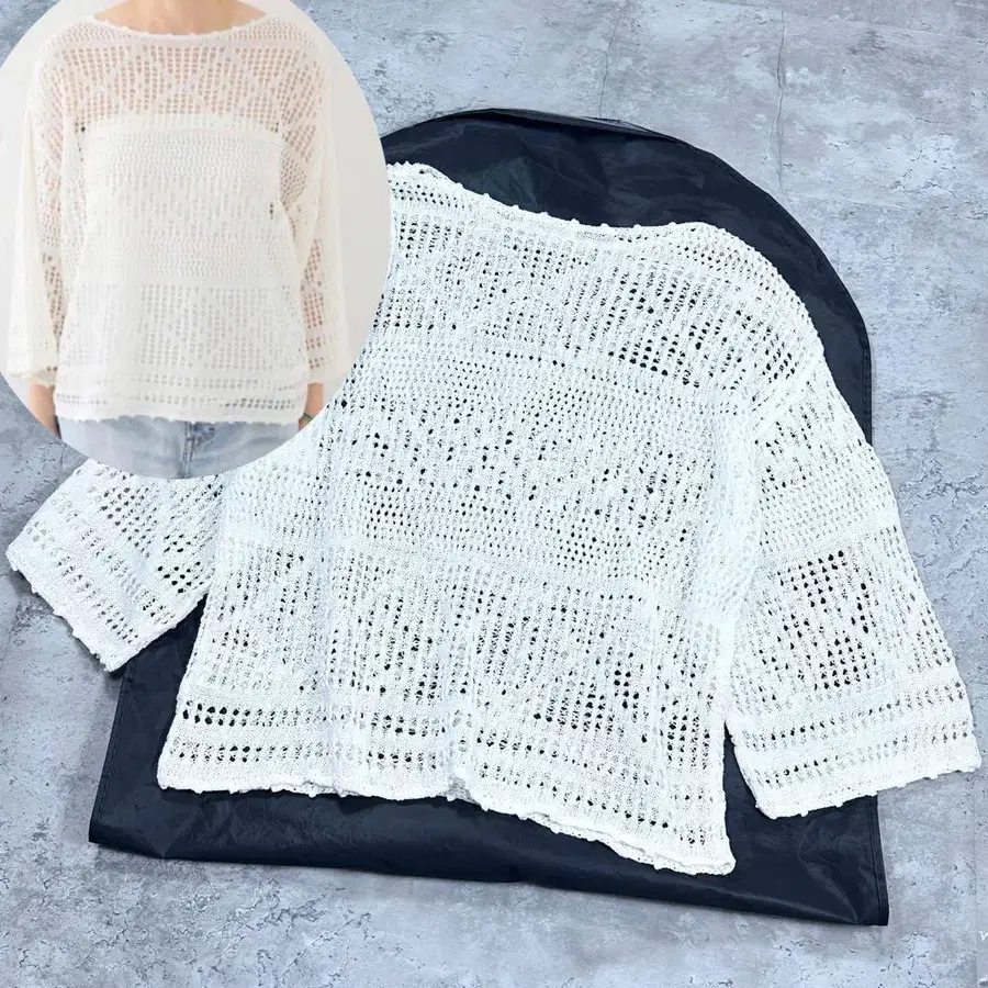 레이스 아이템은 자칫하면 너무 여성스럽게 보일 수 있지만, 기하학 패턴이라 성숙하게 연출할 수 있는 것이 좋은 포인트입니다. 넥라인, 소매, 밑단에는 코바늘 피콧 니팅을 더해 섬세한 인상을 줍니다. 티셔츠처럼 편하게 입을 수 있는 심플한 하프 슬리브로, 팔꿈치를 덮는 소매 길이가 고급스러운 인상을 주는 아이템입니다.