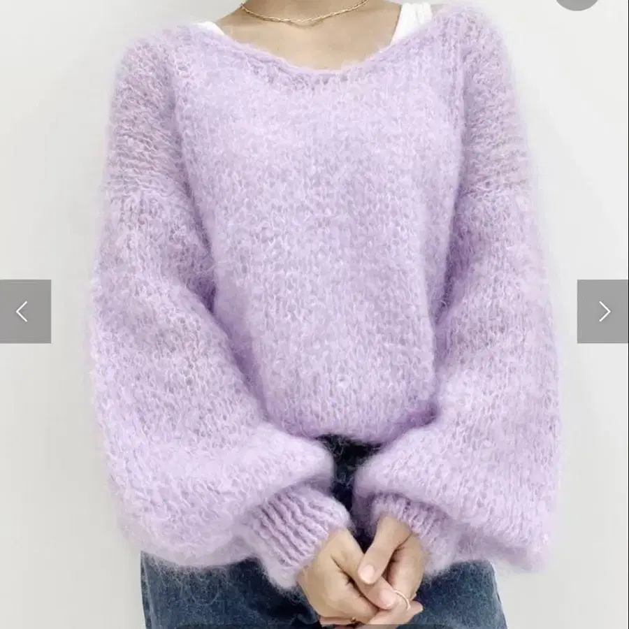 라벤더 색상의 오버사이즈 니트, 모헤어풍 소재로 벌룬 슬리브 디자인.