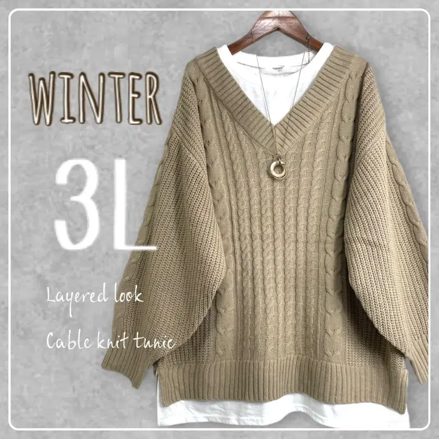 새상품 3L 빅 사이즈 이너 레이어드 스타일 케이블 튜닉 니트 베이지