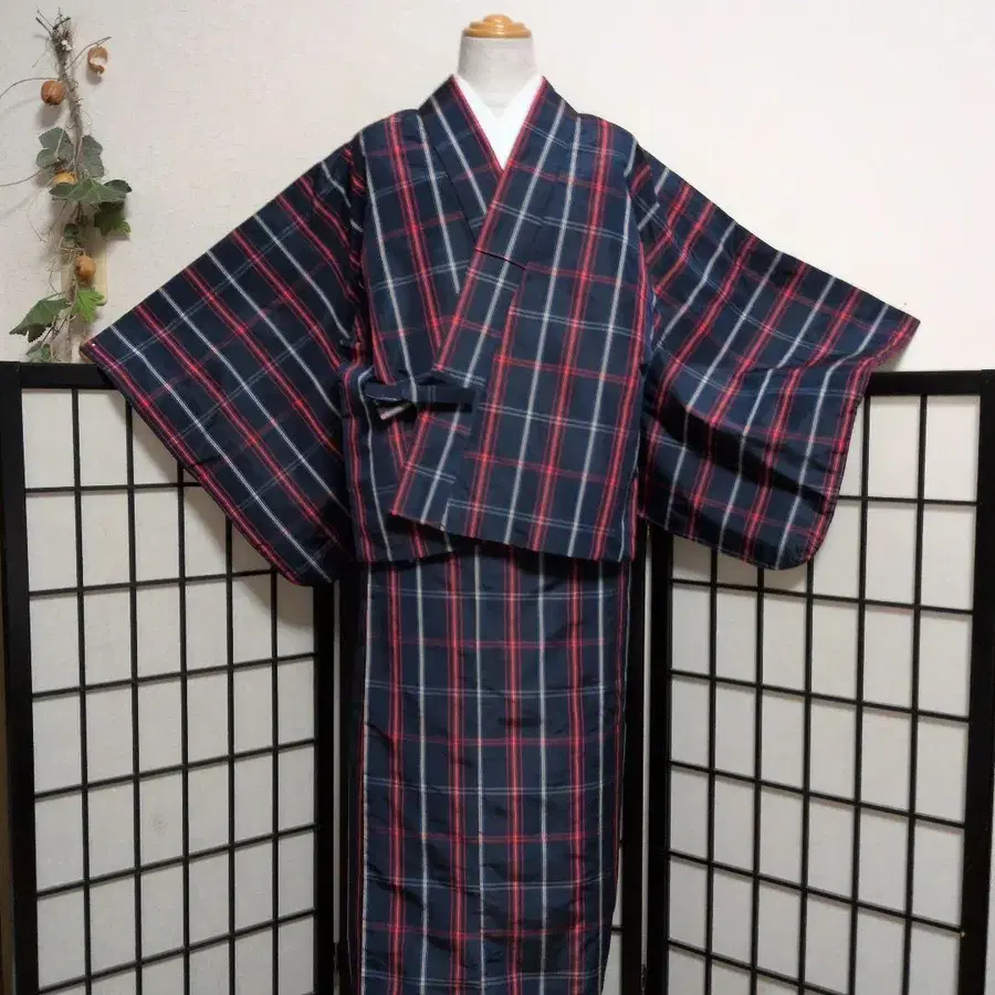 투피스 기모노 네이비와 레드 체크 무늬 코몬 손바느질 화학 섬유