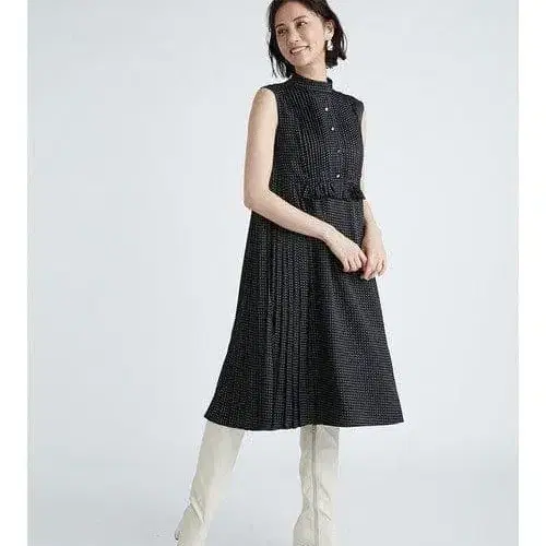 어깨는 팔뚝 부분을 자연스럽게 가리는 크기로 설정하여 스트레스 없는 가슴 너비에, 앞 겨드랑이부터 뒷부분까지 밑단으로 퍼지는 듯한 플리츠를 넣어 샤프하고 고급스러운 A라인 실루엣의 원피스입니다.
