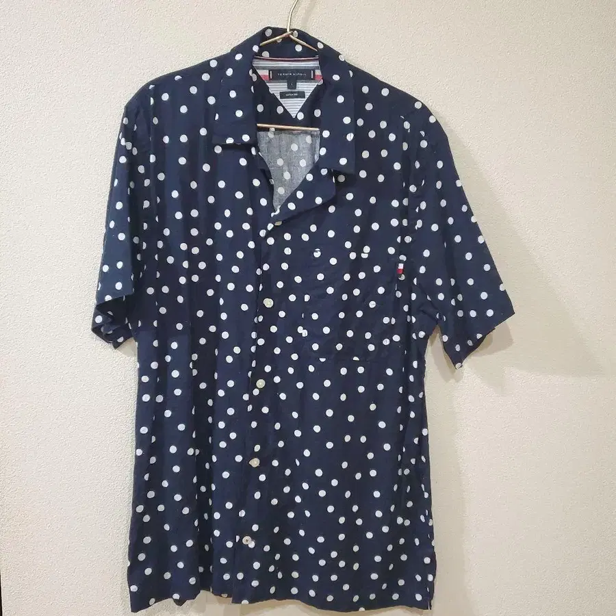 TOMMY HILFIGER 네이비 도트 무늬 반팔 셔츠 L