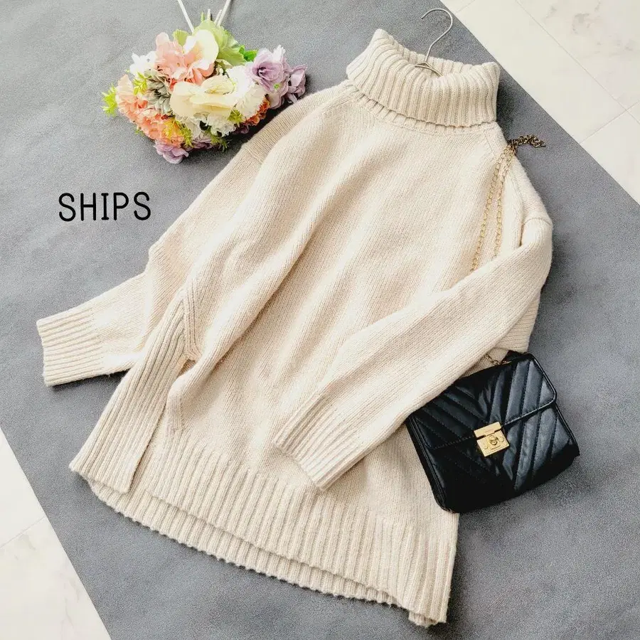 SHIPS*핑크 베이지*사이드 슬릿 터틀넥 니트
