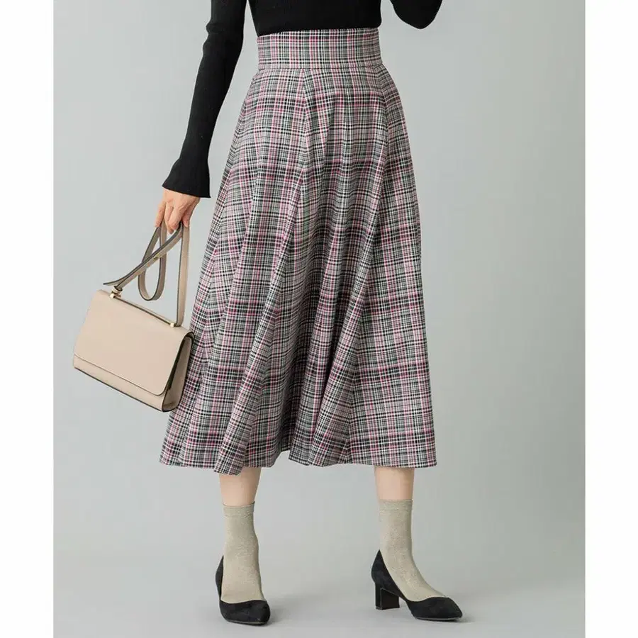 쿠미쿄쿠 워셔블 랜덤 체크 플레어 스커트 핑크 x 화이트 울 혼방 롱