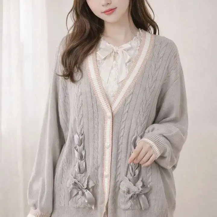 시크릿 허니 V넥 가디건 핑크 그레이 가디건