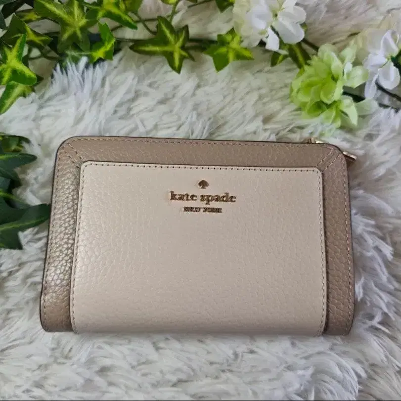 고급스러운 라이트 베이지 계열의 컬러 블록 디자인이 매력적인 케이트 스페이드의 접이식 지갑입니다.