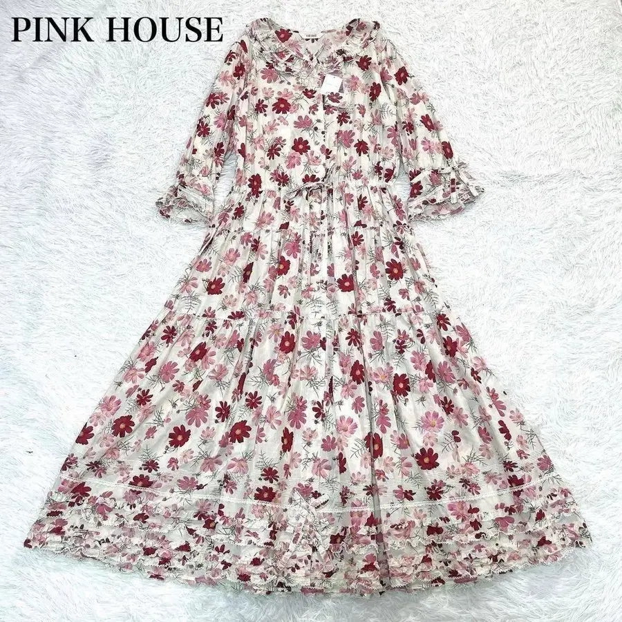 택 포함 새상품 2023년 핑크하우스 코스모스 프린트 원피스 리본