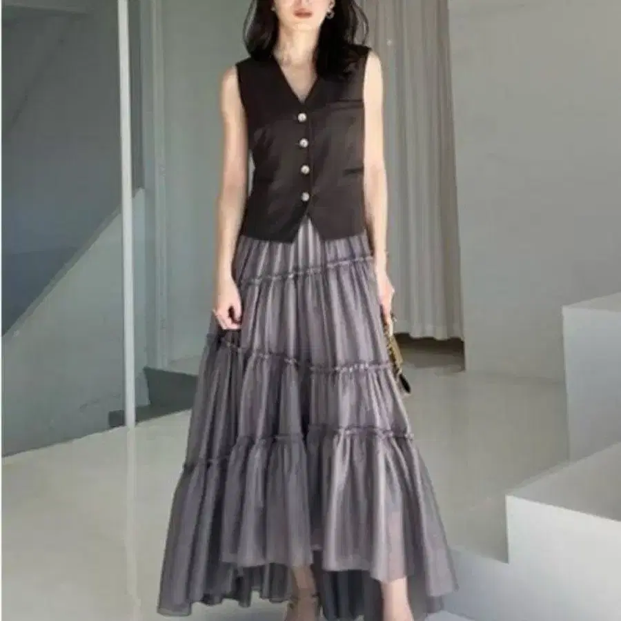 anuans 볼륨 티어드 오간자 스커트 ( KHAKI GREY )