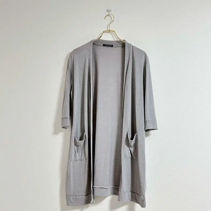 심플한 디자인의 그레이 가디건, 포켓 부착으로 사용하기 편리함.