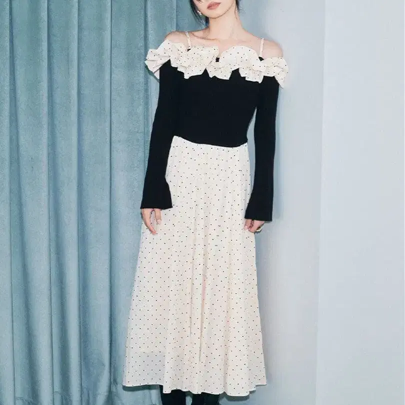 [ 물결치는 프릴 칼라가 인상적인 니트 콤비 원피스 ]