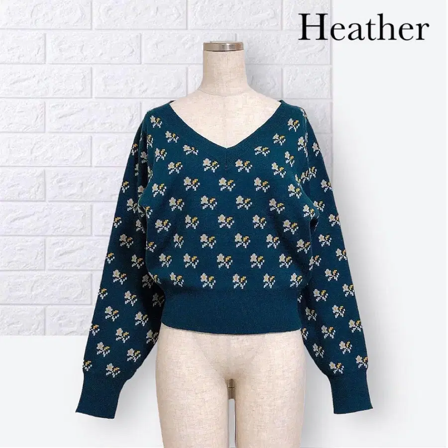 헤더 꽃무늬 V넥 니트 상의 그린