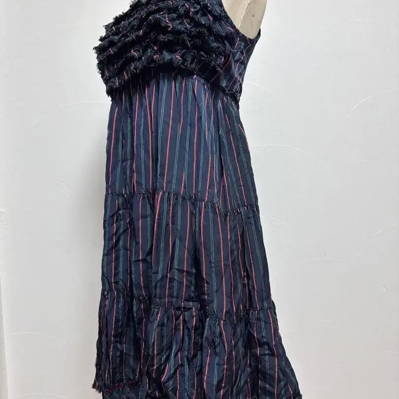 자동 번역되었어요. 원문보기스트라이프 패턴의 슬리브리스 원피스, 가벼운 소재로 쾌적한 착용감.