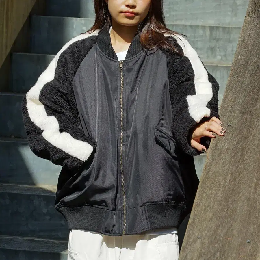 플리스와 나일론의 콤비네이션으로, 봄버 재킷 스타일의 여유로운 핏 재킷입니다.
