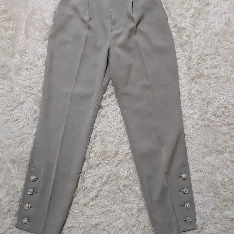 펄 진주 단추가 특징인 그레이 슬랙스.
