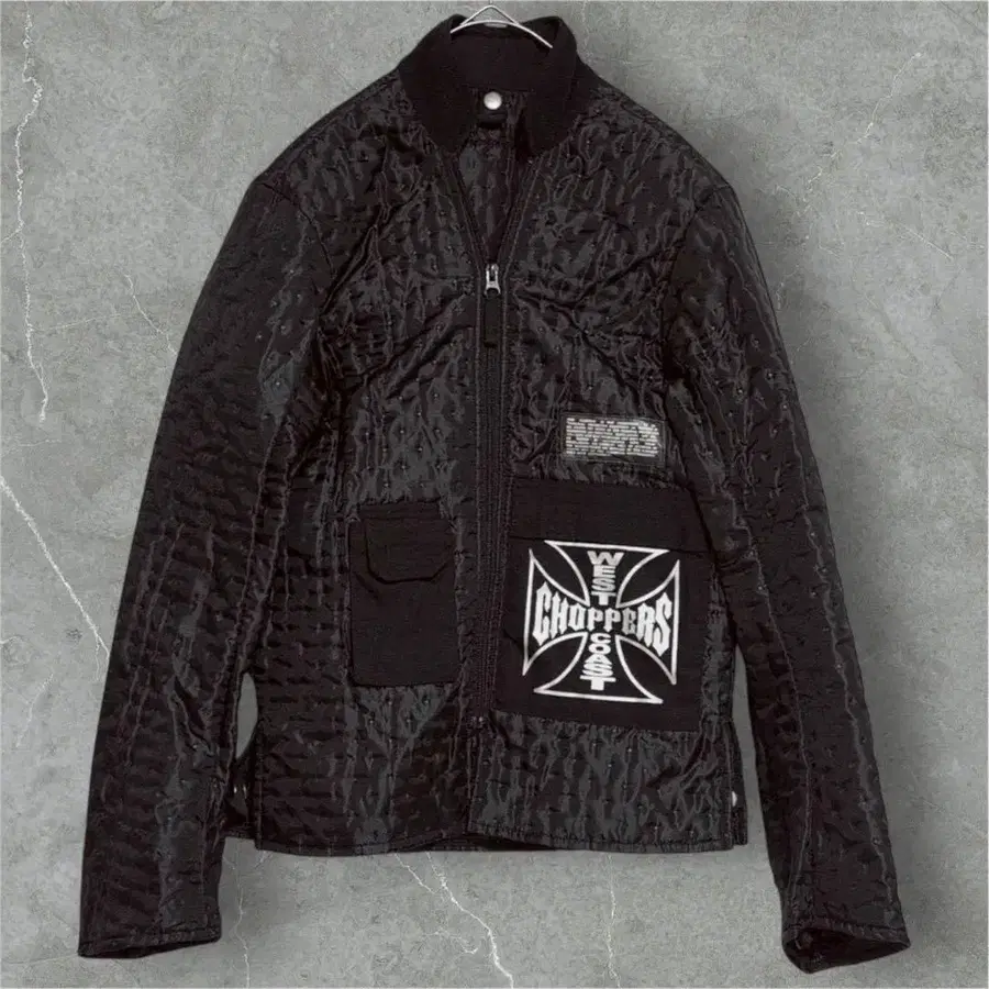 웨스트 코스트 초퍼스 (West Coast Choppers)의 퀼팅 자켓 라이너입니다. 블랙 베이스에 브랜드의 상징인 아이언 크로스 (몰타 십자가) 로고가 특징입니다.