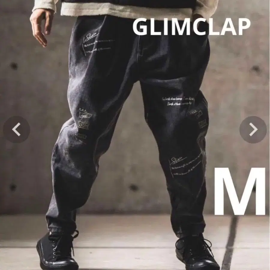 GLIMCLAP Black size M 핸드라이팅 스타일의 로고 자수를 멀티 컬러로 여기저기 새겨 넣은 디자인성이 특징인 테이퍼드 실루엣의 데님 팬츠입니다. 백 스타일에는 지퍼 테이프가 보이도록 일부러 거친 느낌으로 지퍼를 설치한 디자인을 결합했습니다. 리메이크 구제 의류를 이미지화한 시선을 끄는 트릭키한 디자인성입니다. 13.5 온스의 면 100% 데님을 사용했으며, 면 100% 데님 특유의 거친 원단감이 빈티지한 이미지입니다. 내추럴하게 색상 빠짐 가공을 하여 오래 입은 듯한 표정을 만든 점도 이 데님 팬츠의 특징 중 하나입니다. 적당한 볼륨감이 있는 허벅지와 엉덩이 둘레에 더해, 밑위도 보통보다 조금 더 깊게 설정한 소프트한 벌룬 스타일 실루엣, 무릎 부근부터 밑단 입구까지는 테이퍼드를 적용하여 샤프함도 더한 실루엣입니다. 허벅지부터 엉덩이 둘레의 볼륨감을 내추럴하게 보이도록 하기 위해 앞부분에 턱을 배치했습니다.
