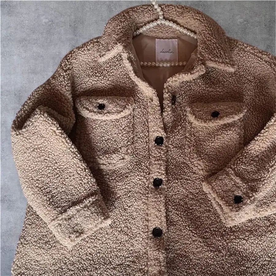 부드러운 보아 소재의 베이지 보아 자켓 셔츠. 오버사이즈 디자인으로 넉넉하고