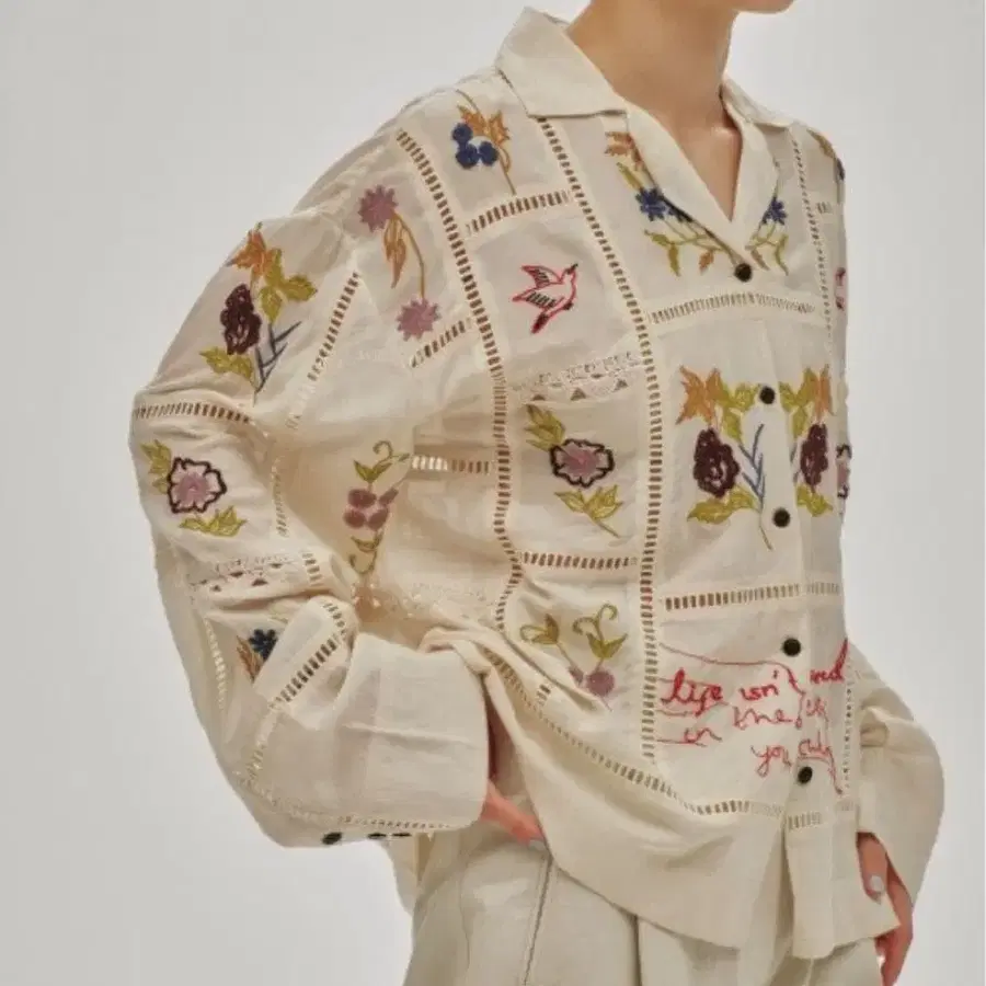 13가지 종류의 자수를 풍성하게 장식한 패치워크가 시선을 사로잡는 오픈 카라 셔츠.