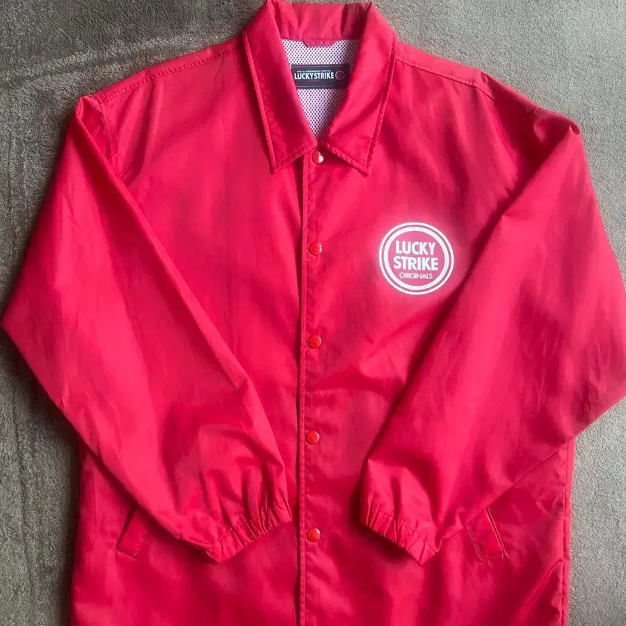선명한 레드의 LUCKY STRIKE 나일론 자켓, 로고 프린트가 있어 스타일리시합니다.