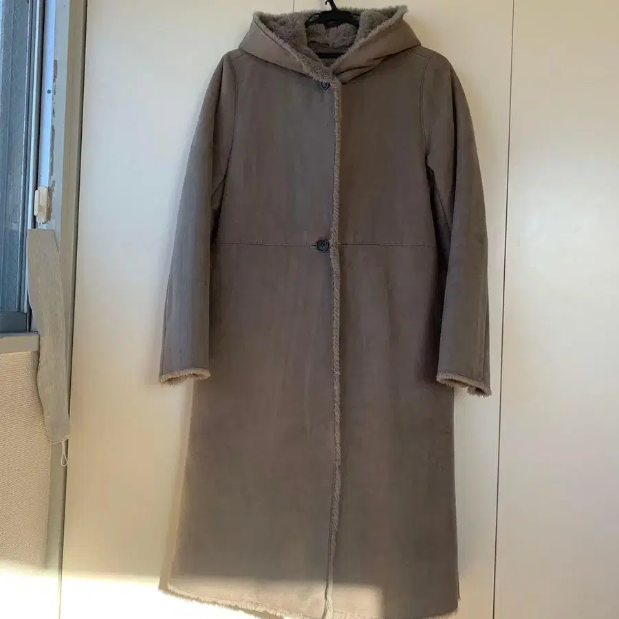 새상품급 빔즈 데 밀크 무스탕풍 후드 부착 롱 코트