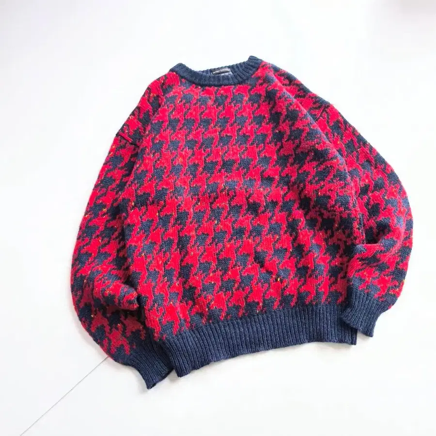 빈티지 셰틀랜드 울 니트 L 하운드투스 빨강 x 네이비 C16